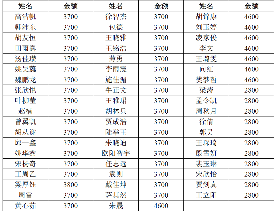 根据学工处大学生奖励与资助中心《关于开展2019-2020学年度国家奖(助)学金评选工作的通知》要求,依据国家助学金评选办法,今年国家助学金金额每生每年在2000元至4600元范围内确定,不可分档超过4档,不可突破上下限额。本着“以学生为本,资助优先”的原则,综合学生贫困认定等级,学院奖助学金评审委员会重新调整了分配原则,资助金额在原评定资助标准上进行了适当调整。特殊困难认定学生给予每人4600元资助,困难认定学生给予每人3700元资助,一般困难认定学生给予每人2800元资助。对于家里是建档立卡家庭但没有评上特殊困难的同学,再给予100元补助。具体评审结果如下: