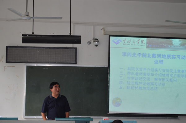 最后,赖旭龙副校长做总结讲话。他首先表达了学校对地球科学菁英班的关心和重视。随后,赖校长结合自身的体会,向同学们讲述了参加地质实习的重要作用和意义。他指出,一个人的远大理想和抱负只有通过自身的努力才能实现,路都是自己走出来的,对大家而言,地质实习就是我们迈向实践活动的第一步。他希望同学们通过实习活动,进一步增强对地质学专业的热爱,激发科学研究的兴趣;把有苦有累的实习活动当成快乐的学习,扎实学好专业基本技能;同时,通过实习活动,培养自己吃苦耐劳的精神;在实习过程中,团结协作、互帮互助,培养团队精神。