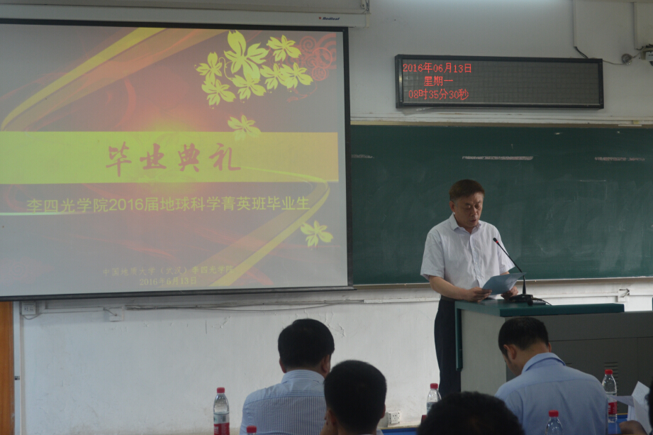 校党委副书记傅安洲对菁英班在协同育人联合培养模式下,四年来取得的成绩给予了肯定。他希望,同学们在即将开始的新征程中,珍惜荣誉,牢记使命,在科学大师李四光的指引下,弘扬李四光精神,爱国奉献,追求真理,敢于担当。