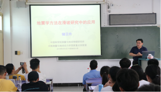 9月3日下午,中国科学院测量与地球物理研究所研究员储日升老师出席十大买球官网2019级新生开学典礼,并与十大买球官网新生进行了交流。储老师以“地震学方法在滑坡研究中的应用”为主题为19级带来了大学的第一场专业讲座。储老师以深入浅出的语言,结合生动形象的图片、视频以及PPT特效,向大家阐述了滑坡的类型、地震等级的测量以及地震学方法在滑坡研究以及预防滑坡灾害之中的应用,为同学们了解地质知识、增强专业认同打开了一扇窗,让同学们受益匪浅。
