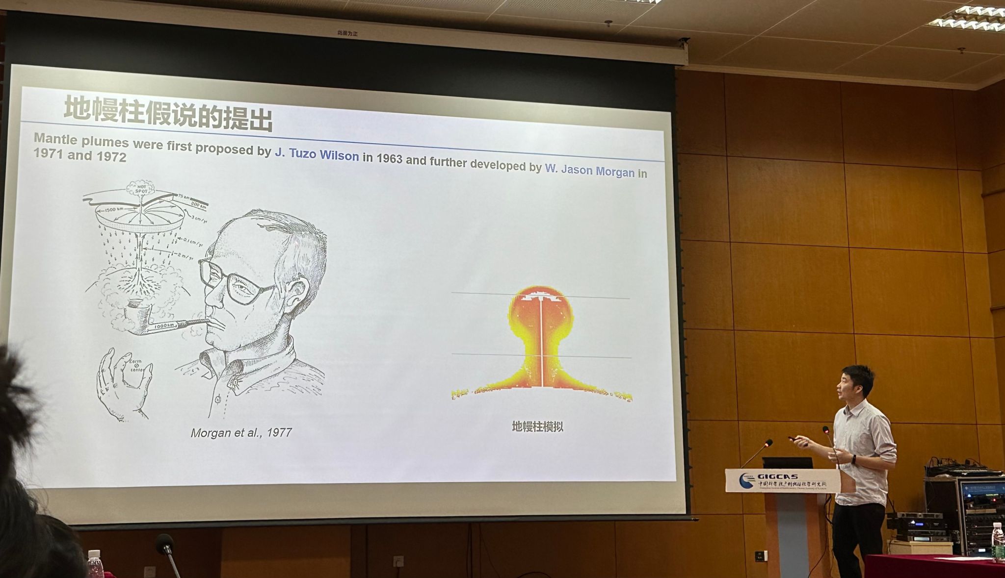 接下来,由邓阳凡研究员为同学们做“地幔柱的地球物理响应”报告,邓老师从地幔柱假说的发展历程开始展开今天的报告,指出了研究地幔柱的意义和地球物理响应,并展望了未来聚焦的研究方向等。