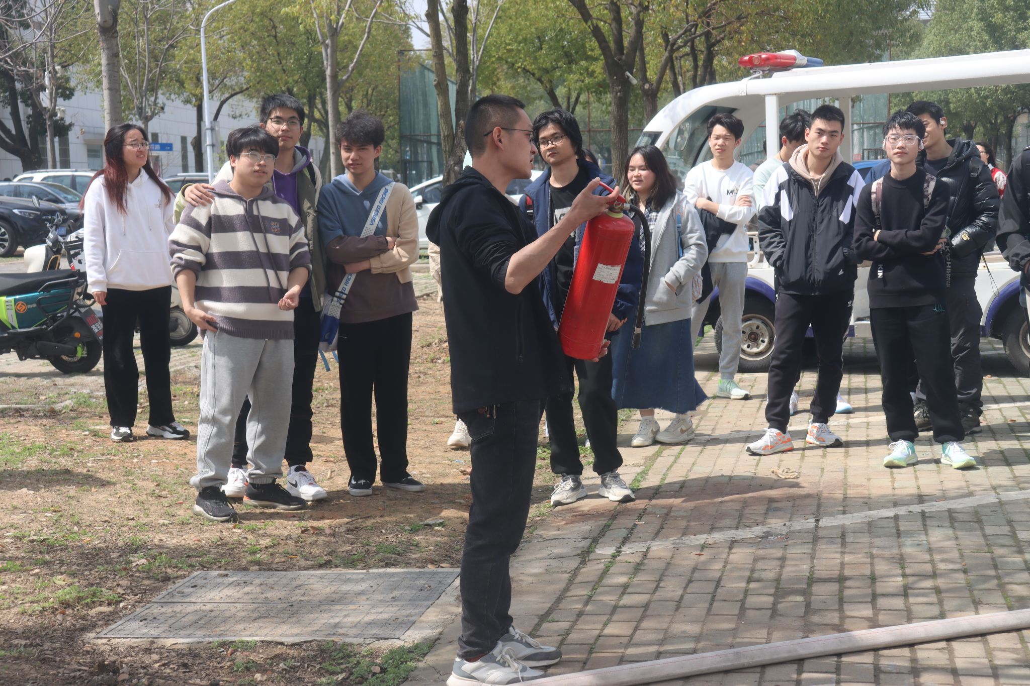 纸上得来终觉浅,绝知此事要躬行。检验理论学习成效的最好方式是付诸行动于实践,为了能在实战中锻炼了同学们面对火灾的紧急逃生和自救能力,2023年3月21日上午11:50,十大买球官方网站于北区艺媒大楼门口进行消防演练。同学们在保卫处的带领下进行了实地疏散逃生和灭火演练,并通过保卫处老师的讲解中进一步掌握了灭火器的使用方法和火灾应急处置办法,提升了突发事件应急逃生、自救自护的能力,以“亲身实战”的方式增强了消防安全意识和应对突发事件的能力。