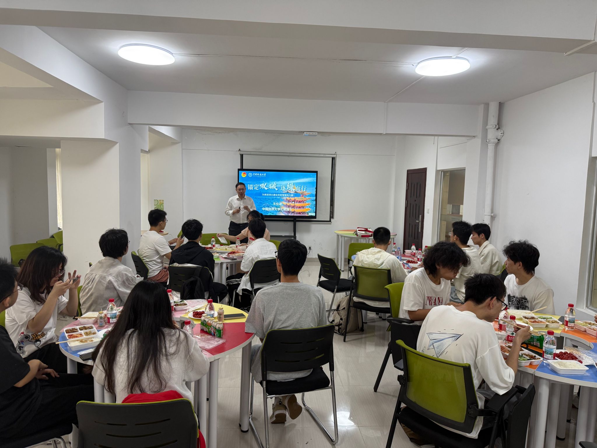 本次论坛以茶话会形式开展,同学们在享用午餐的同时聆听王伦澈教授的分享。王伦澈教授风趣随和的风格让现场氛围格外轻松,他不时鼓励大家边吃边交流,拉近了与同学们的距离。