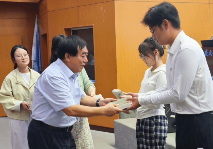 赖旭龙教授向新生代表授书。授书书目为《温家宝地质笔记》和《李四光传》,旨在引导新生始终怀揣地质报国之心,把《地质笔记》的求真细致,化为每天的观察与求索;把《李四光传》的家国担当,化为一生的方向与坚持。