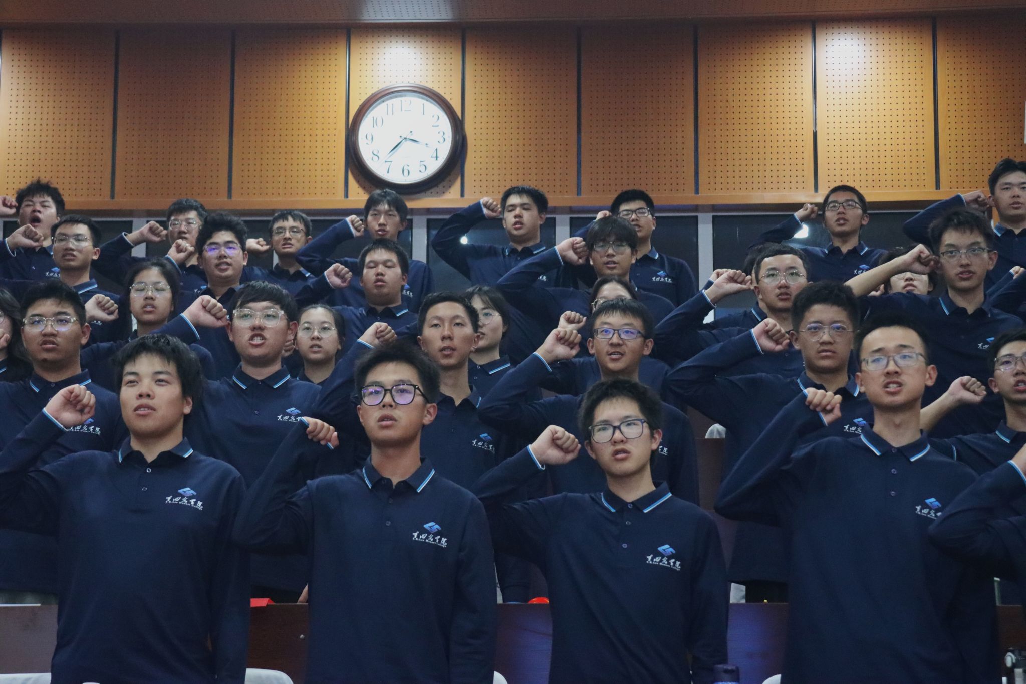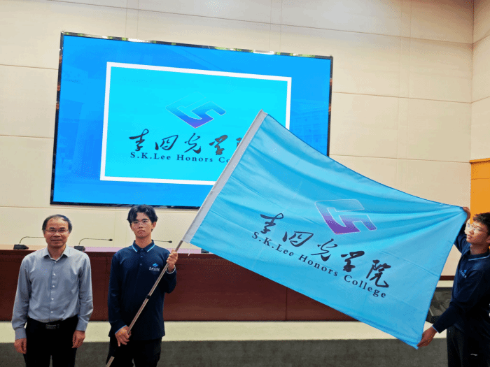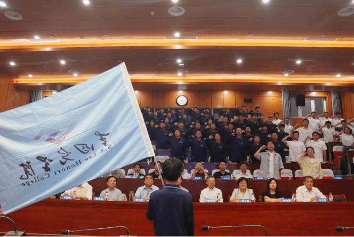 谢树成院士为新生代表授旗,在代表十大买球官方网站的蓝色院旗下,全体2025级新生在2022级优秀学生代表曾竑堃同学的领誓下,以青春的名义承诺践诺。