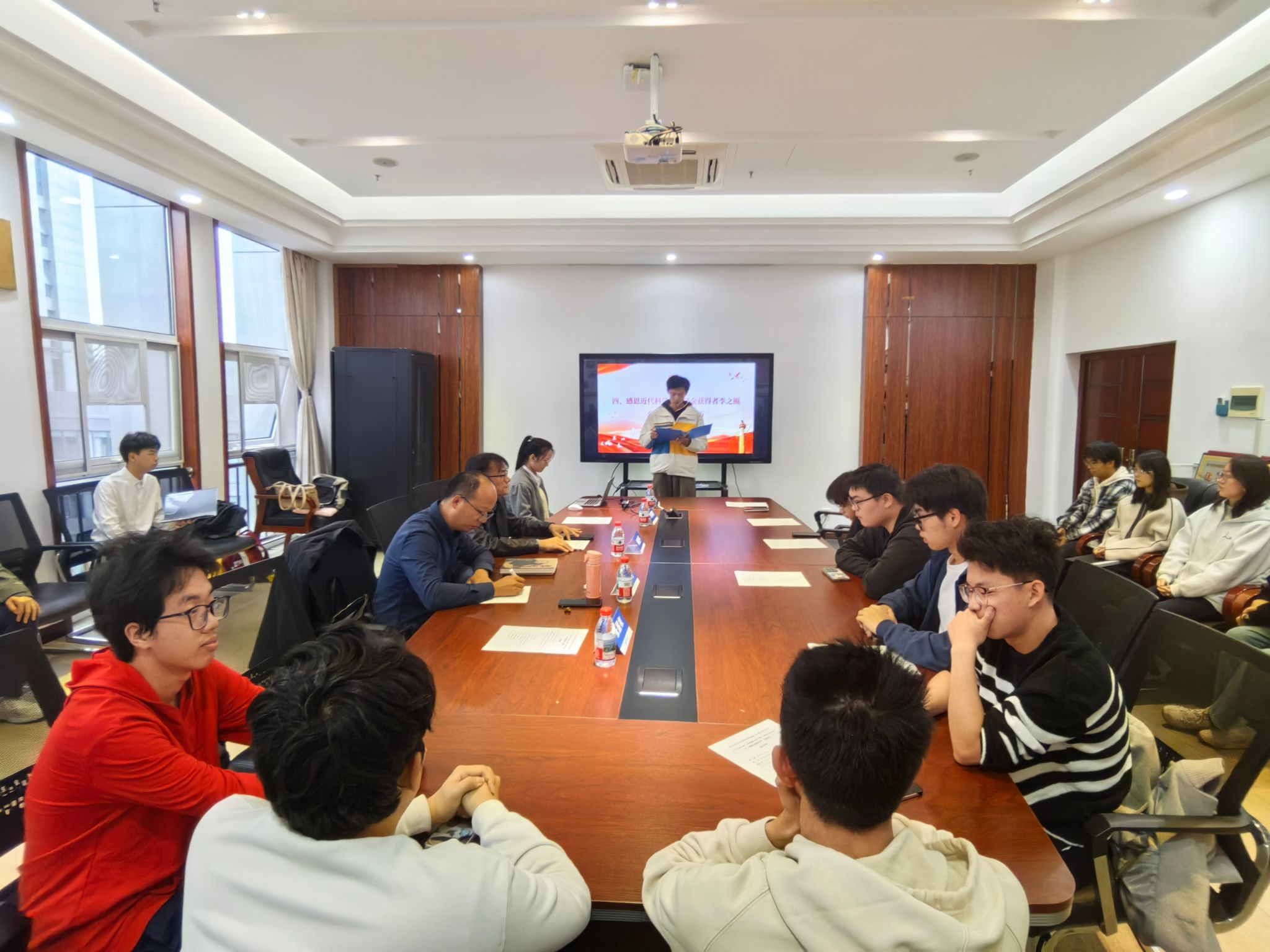 活动伊始,全体团员起立,高唱《中国共产主义青年团团歌》。激昂的旋律回荡在会议室中,不仅展现了团员青年饱满的精神风貌,更拉开了此次主题团日的序幕。随后,在领誓人的带领下,团员们高举右拳,庄严重温入团誓词,“我志愿加入中国共产主义青年团,坚决拥护中国共产党的领导……”铿锵有力的誓言,既是对初心使命的回望,更是对传承李四光精神、勇担青年责任的坚定承诺。