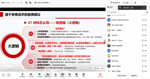 本次大赛自启动筹备以来,得到了各主办学院的高度重视与协同发力,通过构建“动员部署—专题培训—院级初赛—联合决赛”的全流程培育体系,为学子搭建了全方位、多层次的职业规划能力提升平台。赛前阶段,各学院通过发布专项通知、班级动员宣讲、辅导员一对一谈话等多样化方式,广泛激发学生参赛热情,充分挖掘优质参赛项目。11月14日晚,四院联合推出线上专题培训沙龙,王俊老师聚焦职业规划书撰写的核心技巧与答辩实战的关键攻略,结合典型案例深度解析、核心要点系统提炼等方式为参赛学生答疑解惑,300余名参赛学生在线参与学习,培训内容实用性强、针对性足,赢得学生广泛好评。