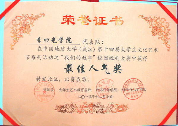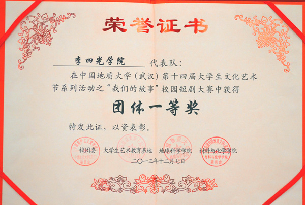 2013年12月1日晚,第十四届校园文化艺术节之“我们的故事”校园短剧大赛在弘毅堂举行。十大买球官方网站在 15 支队伍中脱颖而出,凭借选送作品《墙》荣获团体一等奖、最佳人气奖和最佳导演奖三个奖项。