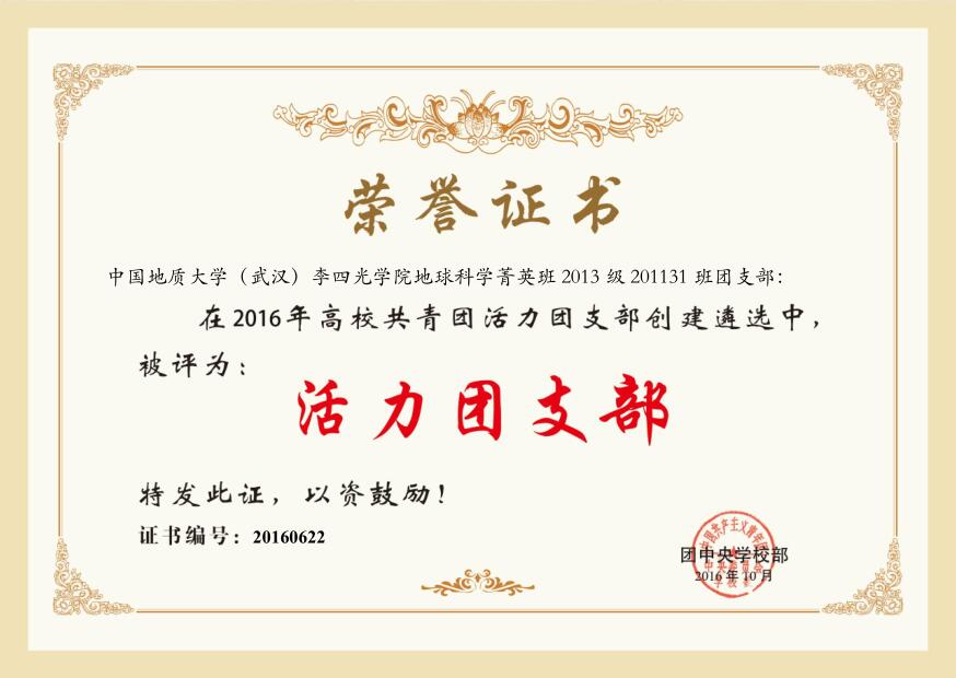 热烈祝贺十大买球官网201131班团支部在团中央2016年开展的高校“活力团支部”创建遴选活动,获得全国高校“活力团支部”荣誉称号!特此报喜!祝贺他们,也希望其他团支部以他们为榜样,把我们的支部建设得更加充满活力、更加坚强有力。