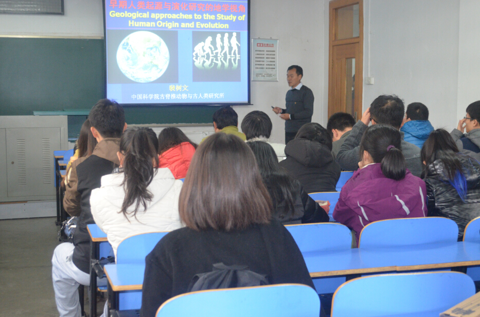 11月27日下午14:00,十大买球官方网站2015-2016学年地球科学菁英班“与中科院名师面对面”系列讲座第二讲在教一206顺利举行,中国科学院古脊椎与古人类研究所裴树文老师为十大买球官网菁英班学生带来“早期人类起源与演化研究的地学视角”的专题讲座。