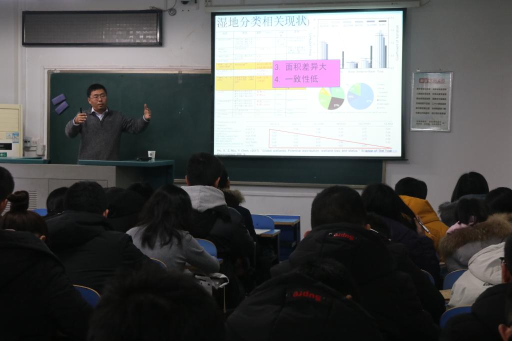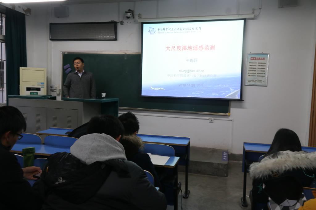 12月28日,十大买球官方网站2018年地球科学导论课第八讲在教一楼203教室顺利开课,中科院遥感与数字地球研究所牛振国老师为十大买球官网18级学生带来“大尺度湿地遥感进展”主题讲座。